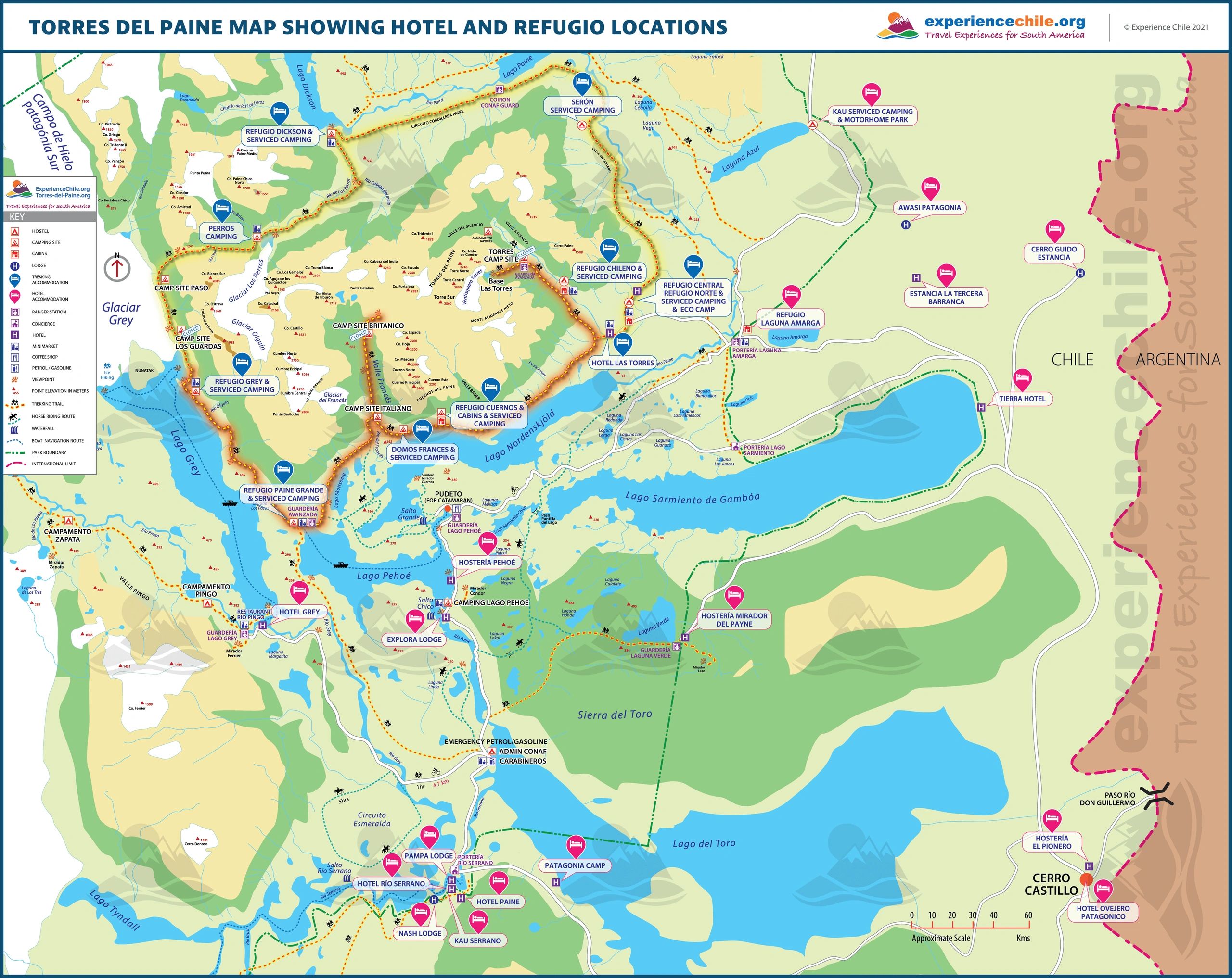 Scenic van tour through Torres del Paine with stops at key viewpoints. morning pickup from your accommodation. 30-minute catamaran ride towards the Paine Grande camping site. Walk along Pehoe Lake while enjoying the view of Paine Horns. 7.5 mile hike.